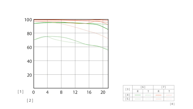 [1] 對比 (%) [2] 與鏡頭光學中心的距離 (mm) [3] 空間頻率 [4] 10 對線條 / mm [5] 30 對線條 / mm [6] 最大光圈 [7] F8 光圈 [8] R:半徑值 T:切線值